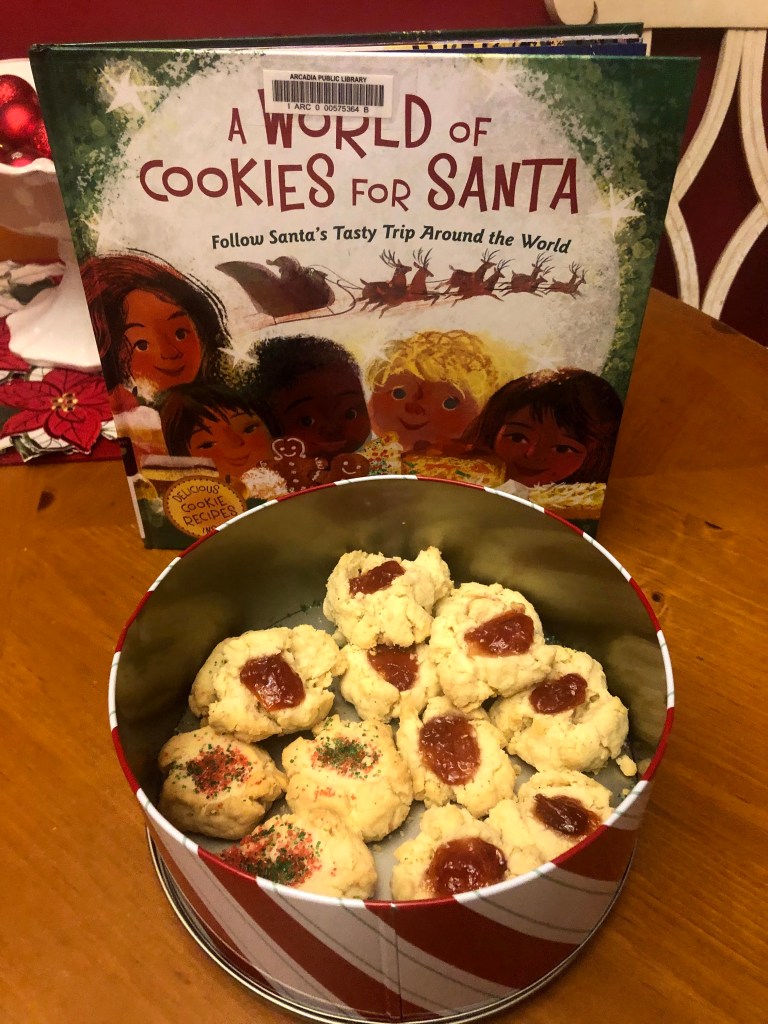 Cookies may not always be the healthiest, but they certainly are the fun-est. And after reading, A WORLD OF COOKIES FOR SANTA, and taking in festive illustrations about cookie traditions from Malawi to Alaska, we decided the Mantecaditos from Puerto Rico looked the most delicious and fun to bake. The book explains, children in Puerto Rico leave them for the Wise Men and their camels, who have come to leave them gifts. The cookie recipe has almond extract in it, which is a favorite of mine, and instructs to put a maraschino cherry in the center of it, but since we just had strawberry jam on hand, we used that instead.